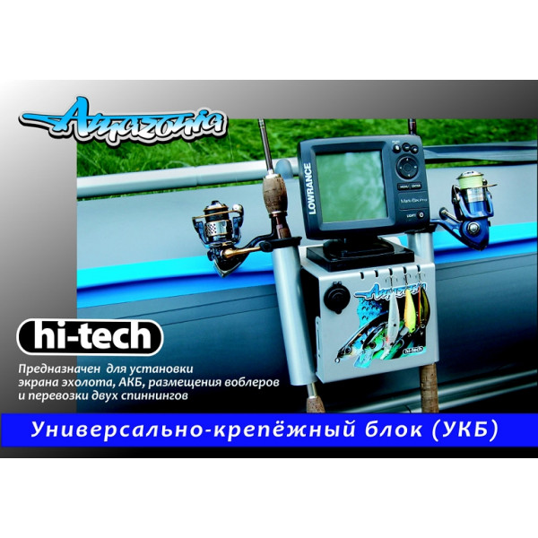 Универсальный крепежный блок Amazonia Hi-Tech устанавливается на лодку на на крепление лик-трос/лик-паз и преднозначен для установки различных эхолотов, АКБ, размещение 5-ти воблеров, а так же держтель двух спиннингов из алюминия в деаметре 40 мм. УКБ выполнен из алюминевого листа 5 мм что делает его давольно таки прочным и удобным в использовании. Так же на УКБ Амазония Hi-Tech есть место для установки розетки от прикуривателя 12 вольт, гамариты УКБ составляют 265x210x155 в милиметрах.